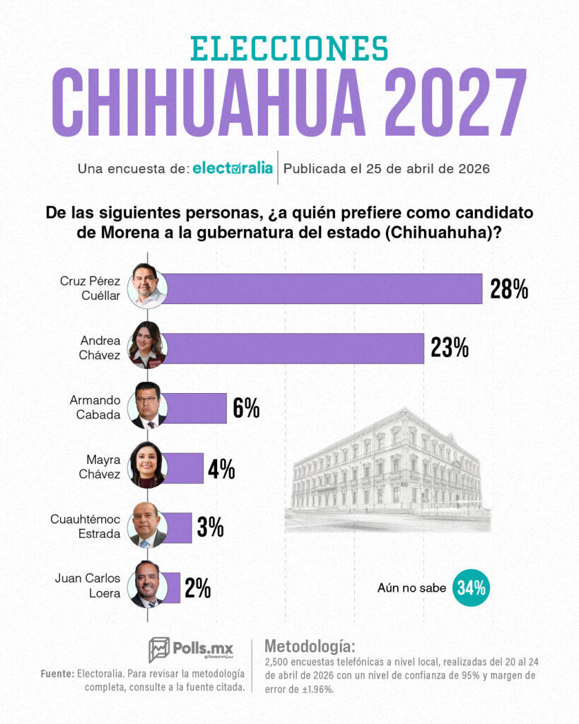 De cara al proceso interno de Morena rumbo a 2027, las encuestas continúan perfilando escenarios que, sin ser definitivos, sí marcan tendencias. Ahora una de Polls, muestra que el alcalde de Ciudad Juárez, Cruz Pérez Cuéllar, encabeza las preferencias con el 28 por ciento, colocándose como el perfil más competitivo dentro del partido guinda. No es una ventaja abrumadora, pero sí suficiente para posicionarse como el referente inicial en la carrera interna.