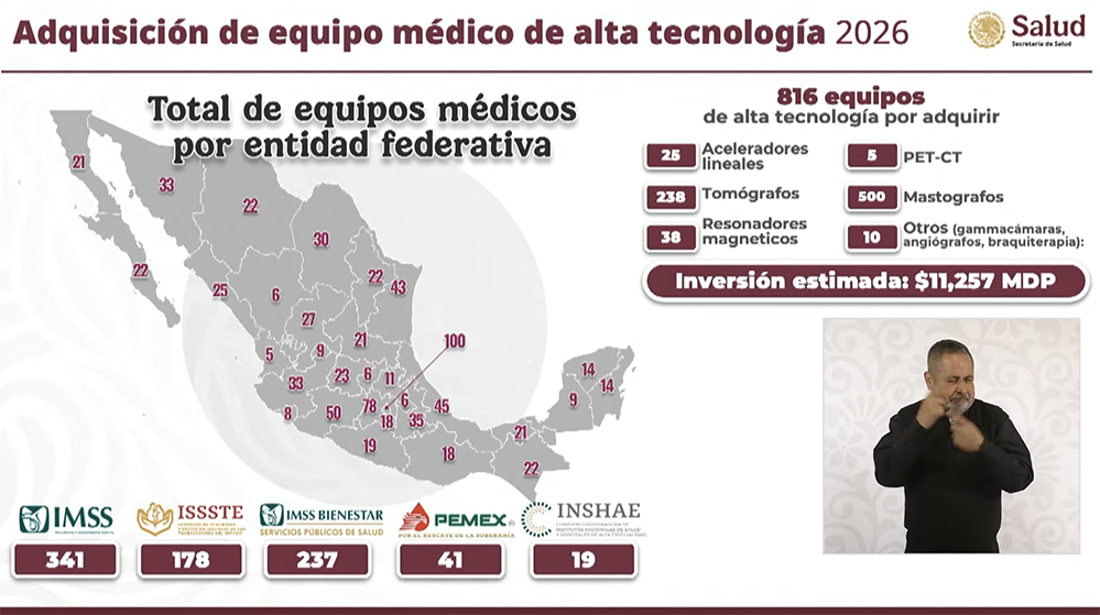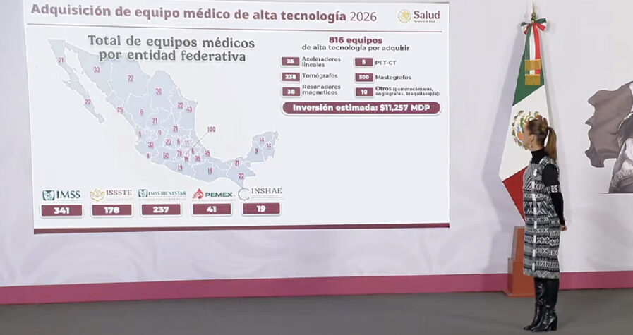 Durante la conferencia matutina de la Presidencia de la República, autoridades de la Secretaría de Salud Federal dieron a conocer un diagnóstico sobre las carencias de equipamiento en el sector salud a nivel nacional. A partir de este análisis, se determinó la compra de 816 equipos médicos especializados, entre ellos aceleradores lineales, tomógrafos y mastógrafos, con una inversión estimada en 11 mil 257 millones de pesos.