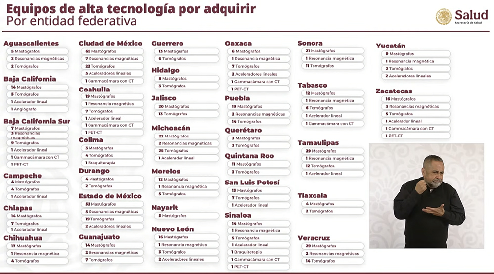 De acuerdo con la información presentada, Chihuahua recibirá 17 mastógrafos, cuatro tomógrafos y un equipo de resonancia magnética, lo que permitirá ampliar la capacidad de diagnóstico y detección oportuna de enfermedades, especialmente en áreas de alta demanda como la atención oncológica.